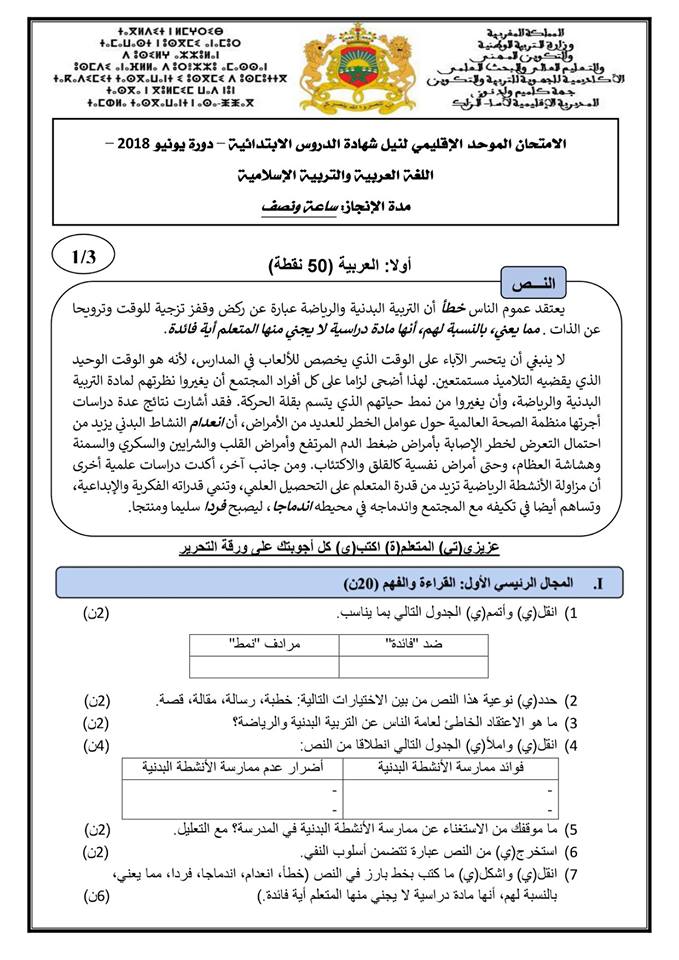 امتحانات اقليمية للمستوى السادس 2018 في اللغة العربية و التربية الإسلامية مع التصحيح