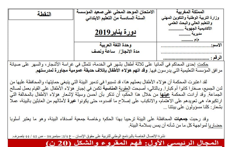 نموذج امتحان محلي للمستوى السادس ابتدائي اللغة العربية يناير 2019 موقع الأساتذة والتلاميذ للتعليم عن بعد