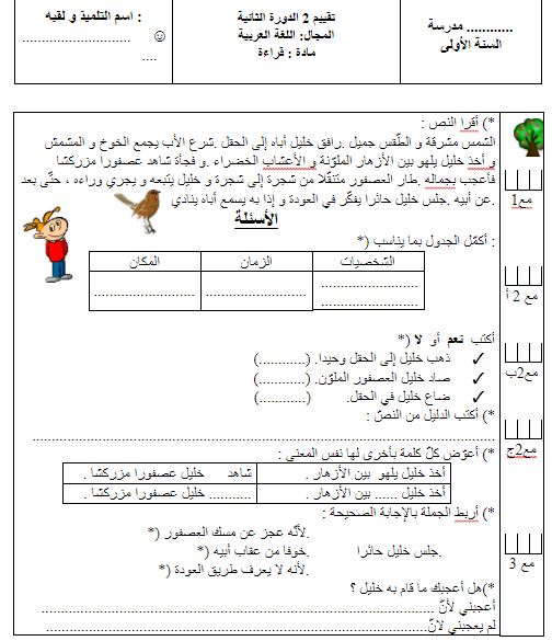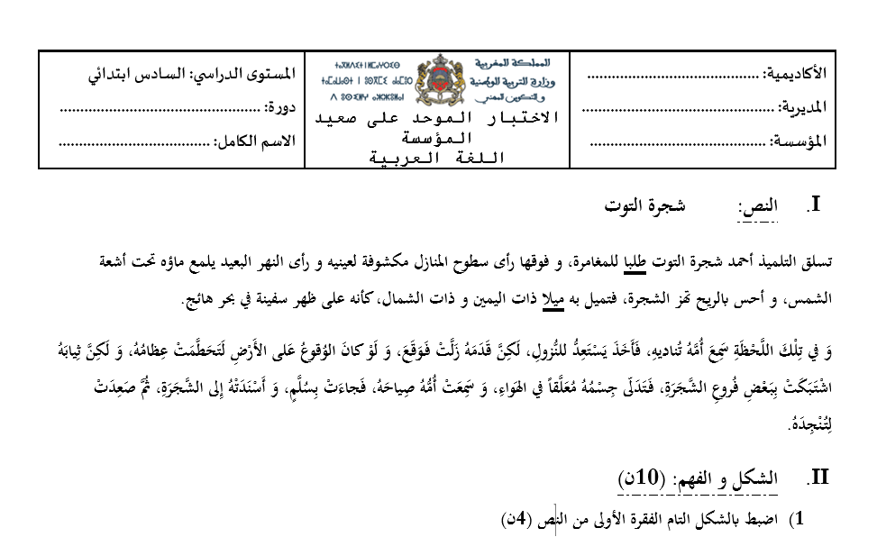 نموذج إمتحان على صعيد المؤسسة في مادة اللغة العربية مرفق بالتصحيح للمستوى السادس ابتدائي