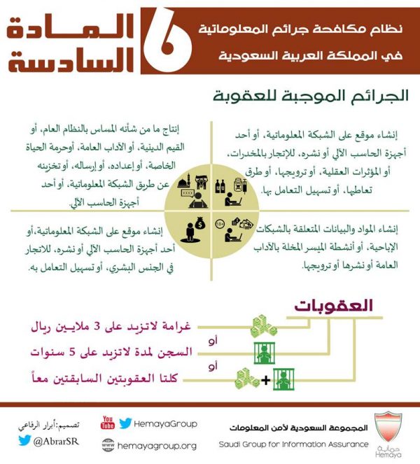 الجرائم الموجبة للعقوبة حسب نظام الجرائم المعلوماتية السعودي المادة ٦ مبادرة العطاء الرقمي