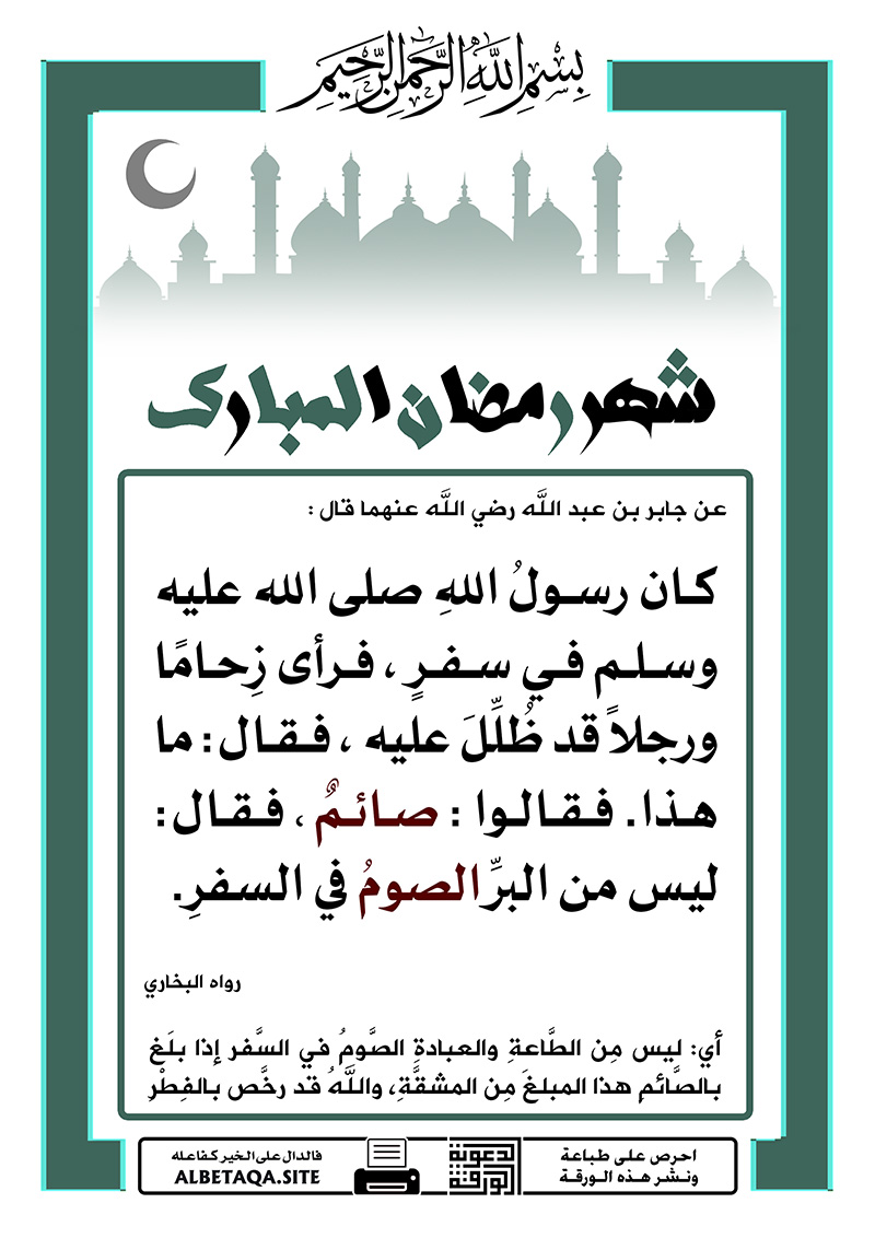 ليس من البر الصيام في السفر. أي ليس من البر الصيام في السفر أبدلت اللام ميما في الثلاثة على لغة بعض أهل اليمن حيث خاطبهم النبي صلى الله عليه وسلم بلغتهم وكان هذا الأشعري منهم ويحتمل أن الأشعري بل غ الحديث بلغته فأد اه الراوي عنه كما سمعه ا هـ. ليس من البر الصيام في السفر. ليس من البر الصيام في السفر عن جابر رضي الله عنه قال. ل ي س م ن ال ب ر الص ي ام ف ي الس ف ر ف ه ذ ا خ ر ج ع ل ى ش خ ص م ع ي ن ر آه ر س ول الل ه ص ل ى الل ه ع ل ي ه و س ل م ق د ظ ل ل ع ل ي ه و ج ه ده الص و م ف ق ال ه ذ ا.
